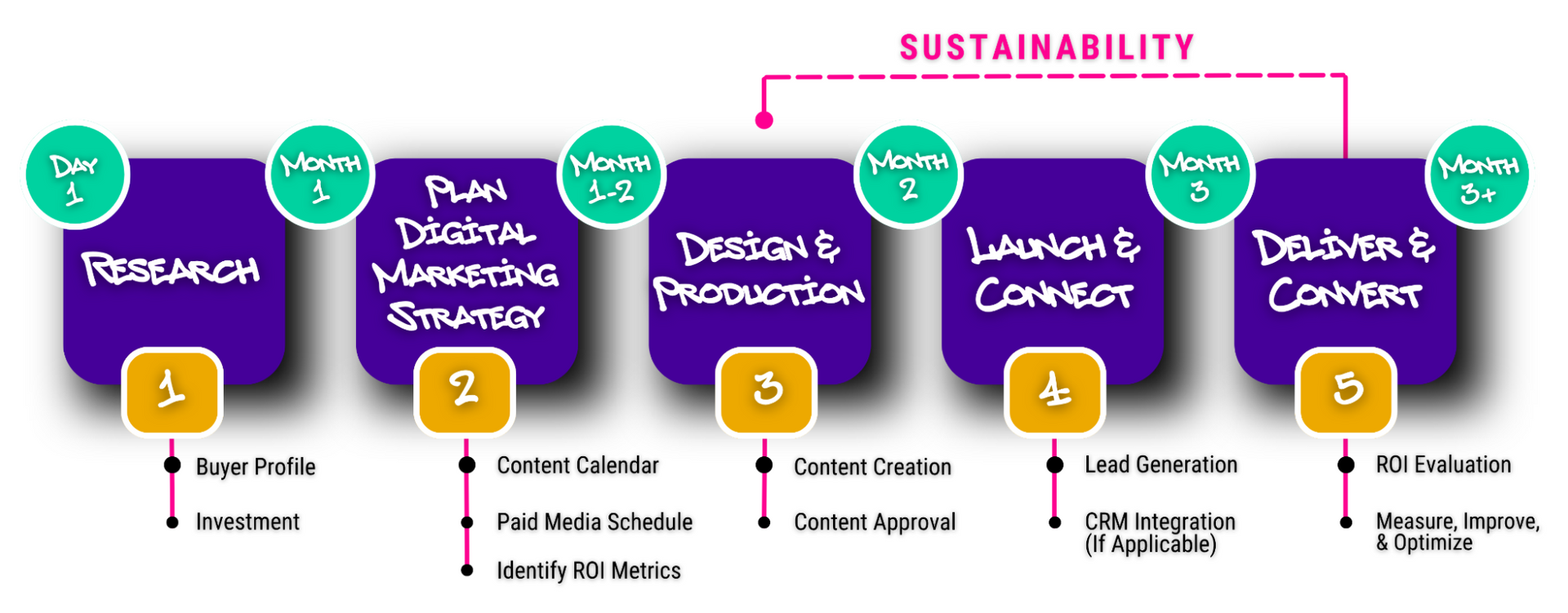 Our process begins with in-depth research to understand your goals, target audience, and overall opportunities for growth. We then develop a tailored digital marketing strategy, identifying the right channels, messaging, and metrics to drive success. Next, our team moves into design and production—creating content, optimizing platforms, and preparing campaigns for launch—before connecting everything through strategic deployment across paid, organic, and social channels. Finally, we focus on delivering and converting leads while continuously measuring performance, refining strategies, and improving results for long-term, sustainable growth.